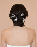 Delightfully delicate, this quad of flower hairpins are ideal for a garden oasis nuptial. Scatter them in loose updo or playful braid for a botanical accent. The crystal sprays that burst from the satin flowers adds a dash of shine.