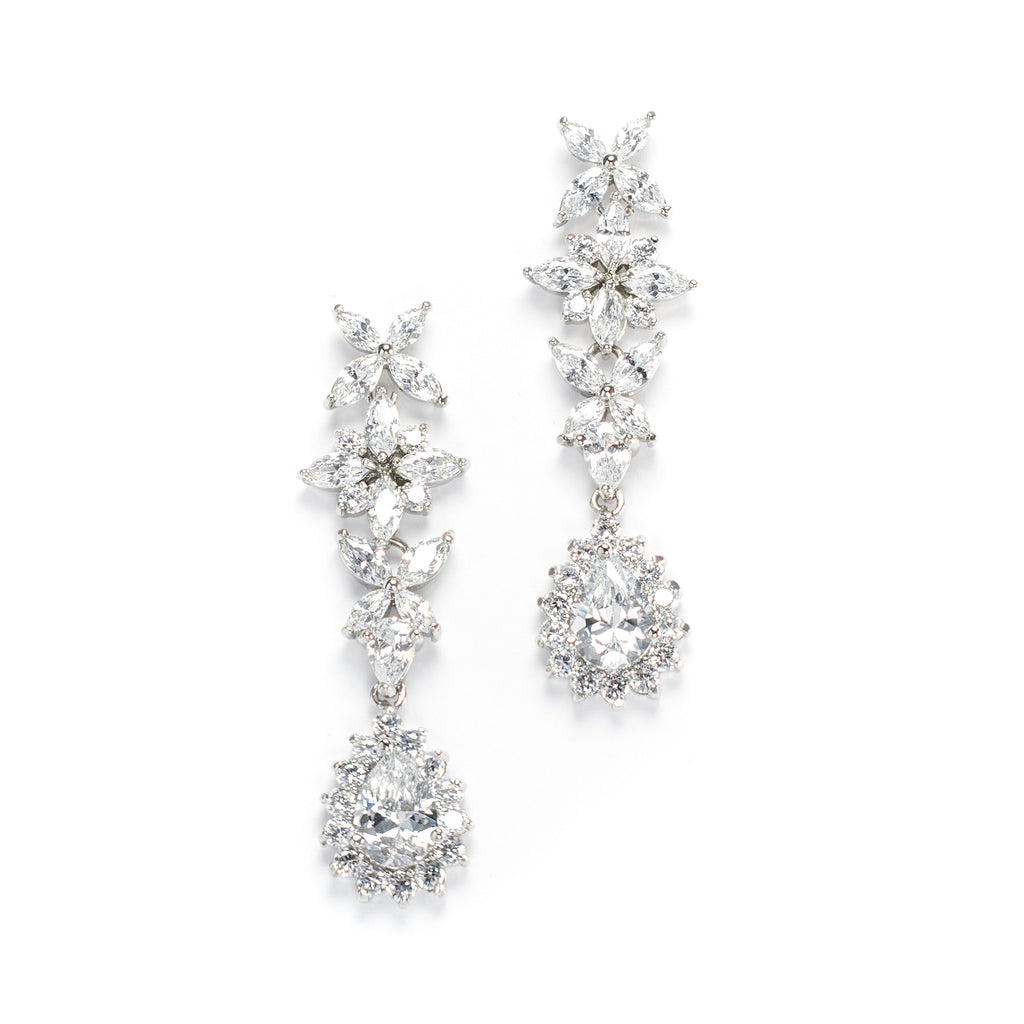 All eyes will be on you with the Yasmin Floret Earrings. At the end of a trio of luminous, floret Swarovski crystals is a radiant pear-shape crystal surrounded pave crystals. Finished in 14k white gold.