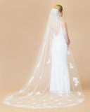 It's your wedding, and you are allowed to have everything...even in your veil. This incredible cathedral length veil includes a silver-thread pencil edge, gorgeous beaded, floral lace appliqués, and a hint of sequins for a little shine.