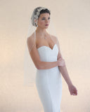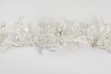 Add luxe glamour to your wedding gown. This breathtaking fingertip length veil features a sculptured silver lace "headpiece" with dazzling crystals and metallic cording. This lace is sewn onto the comb and extends past the comb onto the hair so this stunning veil is both a headpiece and veil in one. The body of the veil has delicate bugle beaded edging for luxurious wedding style.