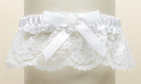 This romantic bridal garter has a scalloped lace edge on a white satin band adorned with a bow and a precious heart made of tiny pearls.