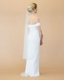 A little sparkle never hurt anyone. A ballet length veil is ideal for a bride who wants a longer veil without covering her train. This glamorous veil is trimmed with 2 rows of crystals to make the perfect statement.