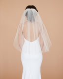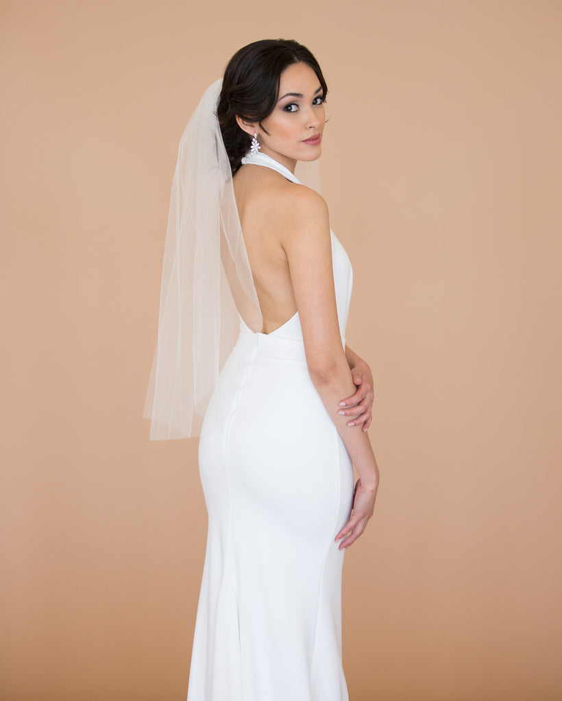 This one-layer elbow length veil offers a subtle light-as-air feel. The ethereal softness adds an understated finishing touch to your wedding style. This veil features a raw edge cut for an ultra sheer look and a tulle wrapped comb.