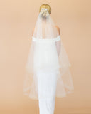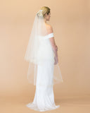 Horsehair trim is a type of crinoline netting that creates beautiful structure and dimension to veils. The 2" trim on this veil is sure to add an abstract element to your simple gown or a dreamy feel to your lace gown. This circle-cut veil offers 2 layers which can be used as a blusher or to just add a beautiful cascading effect.