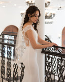 Old World vintage romance at its best. Beautiful, re-embroidered lace trim starts at the comb and follows down to the tip of the veil which ends midway down the back.