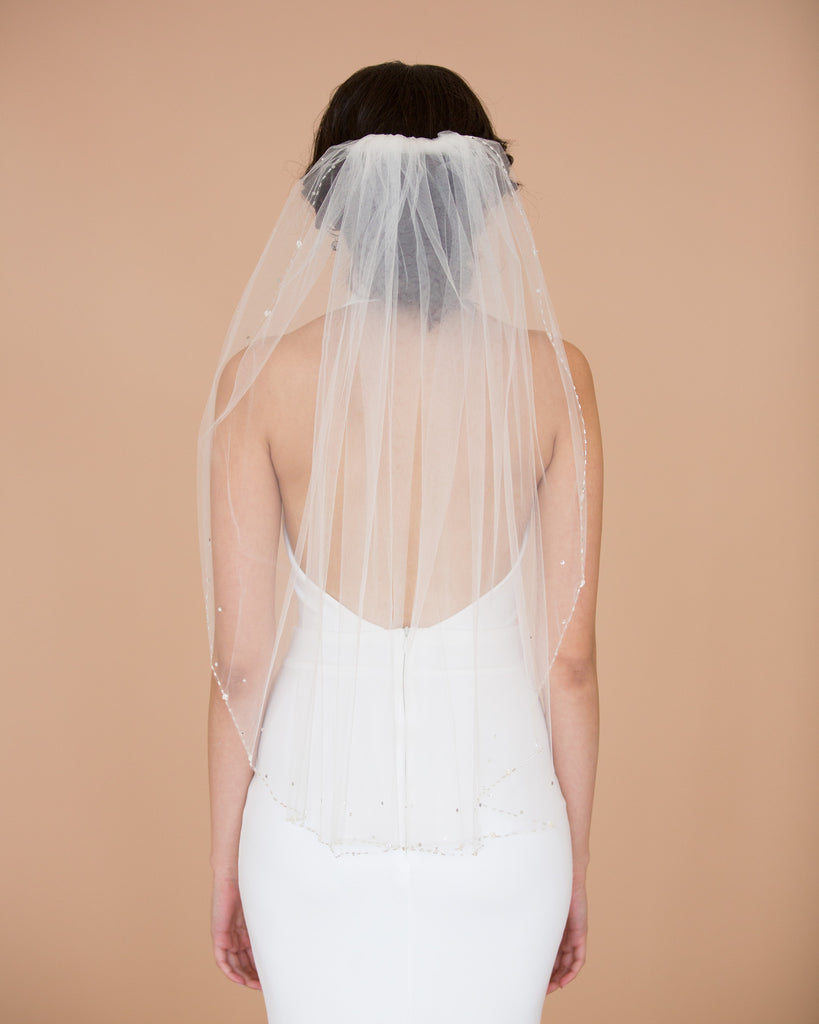 Secured with a comb, the scattered stones and pearl clusters on this one tier veil will add the perfect amount of twinkle to your bridal look.