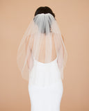 We love anything gilded gold. The metallic gold thread pencil edge of this elbow length veil is a perfect addition to a gold accented gown or to a simple gown needing a little pop of color. Includes a tulle wrapped comb.