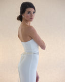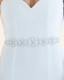 Handcrafted in New York City, this floral crystal belt by Amy O Bridal is sure to freshen up any bridal look. The clear crystal stones exhibits a fun flower motif that is perfect for any spring or summer wedding. Finished with a bridal white, satin ribbon.